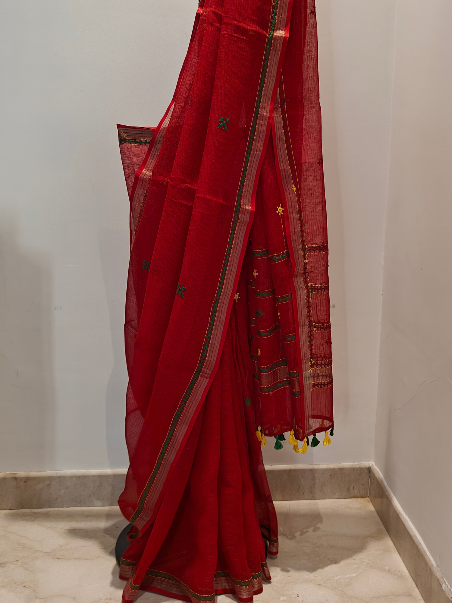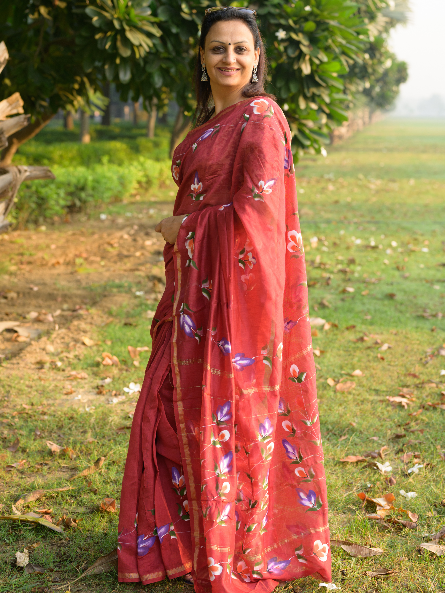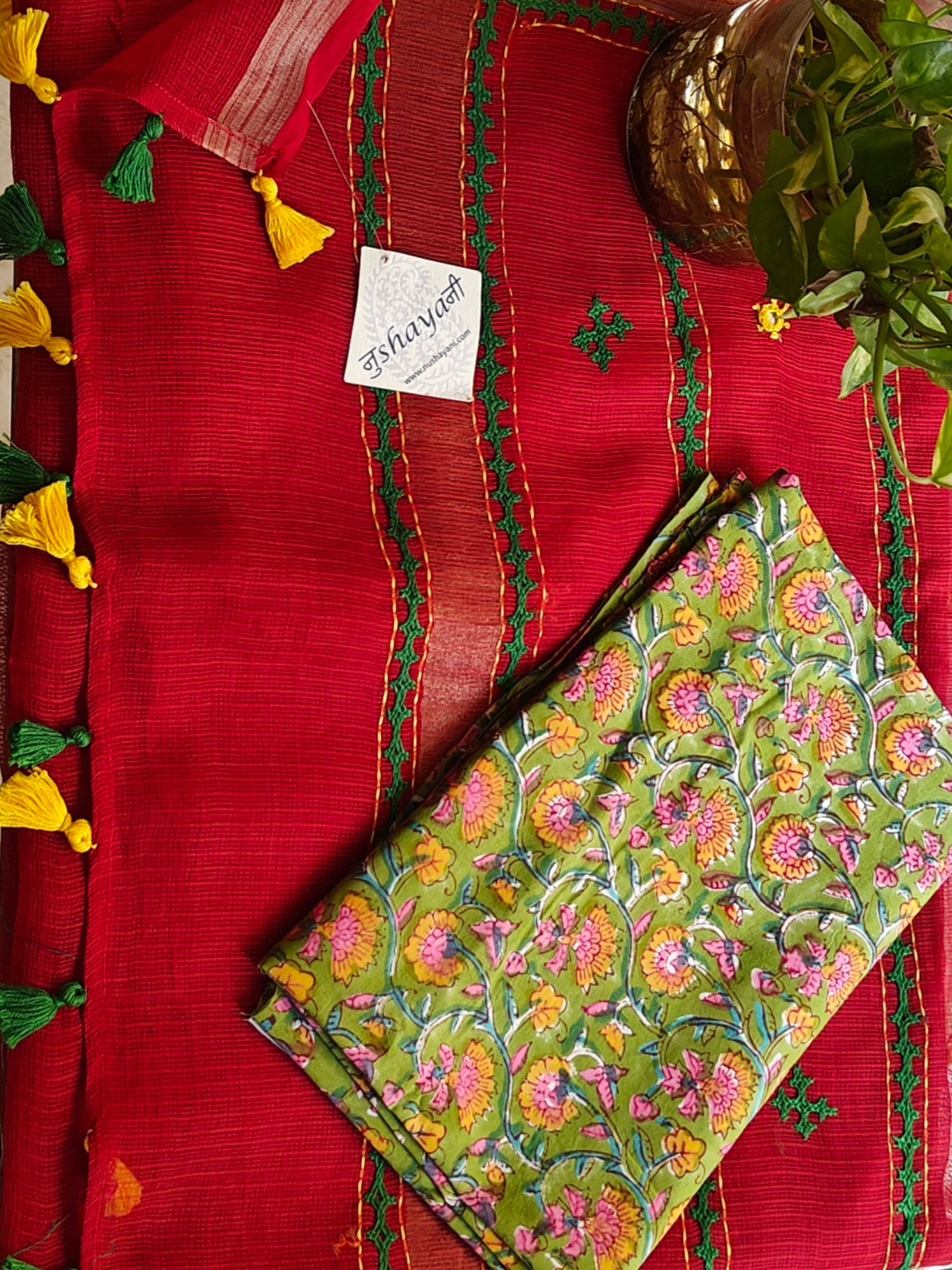 Wine Poppy and Green Cyprus Cotton Handblock Curtain (Pair of 2 Curtains)