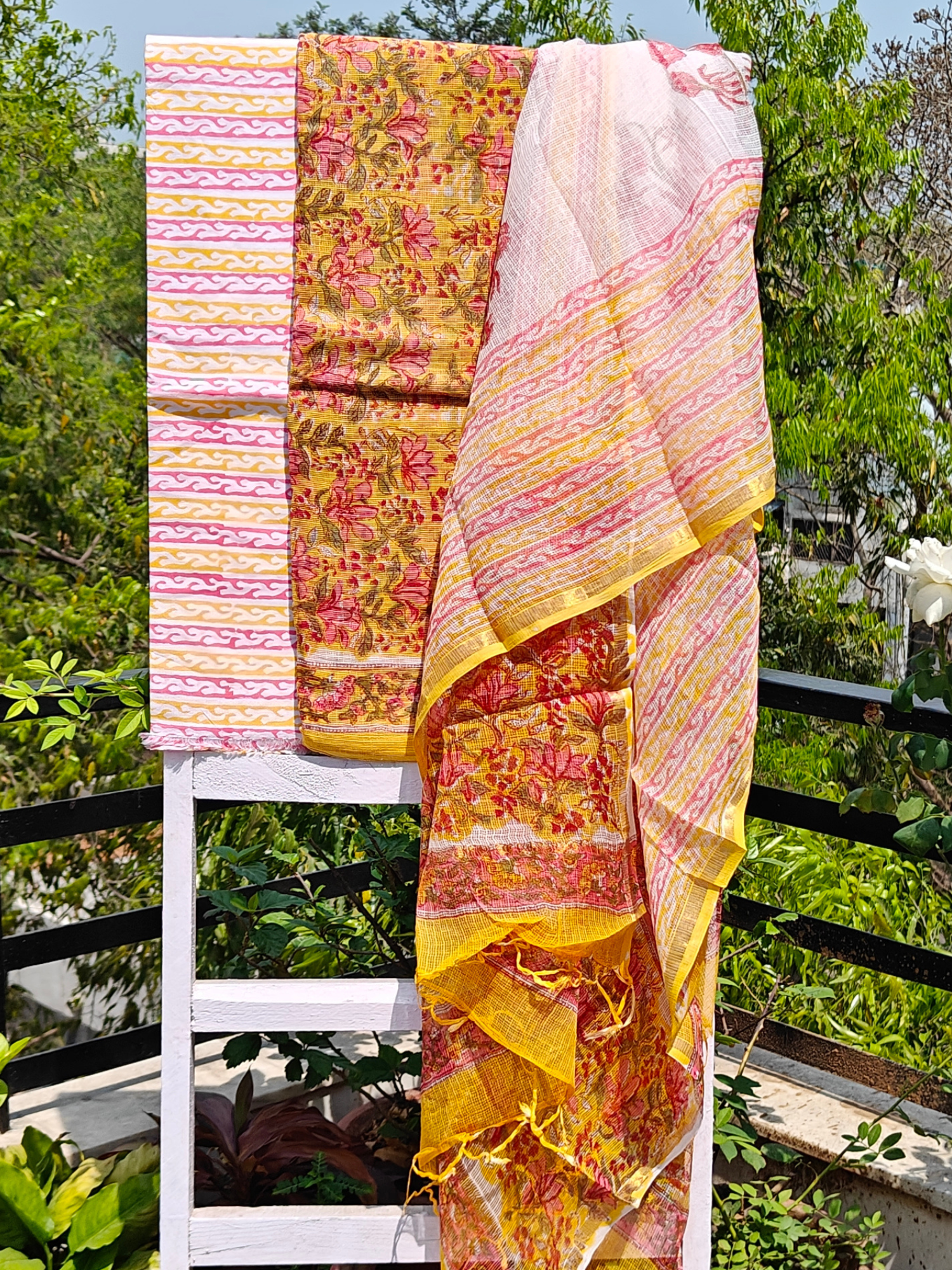 Yellow Brown Gulbahar with Mustard Yellow Jaal Cotton Handblock Combo (Set of 4 Curtains)