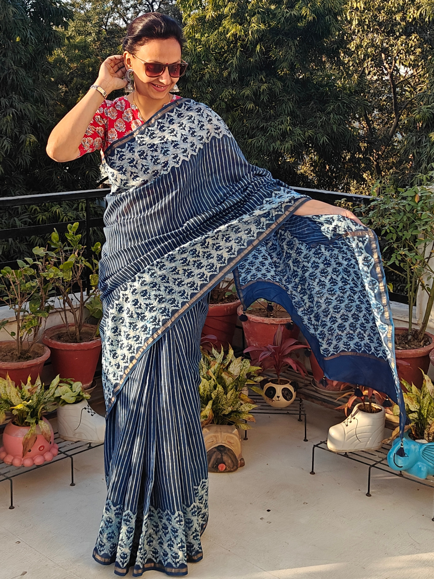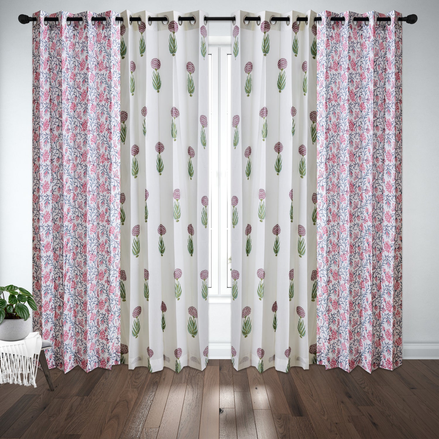 French Garden with Indigo White Buta Cotton handblock Combo (Set of 4 Curtains)