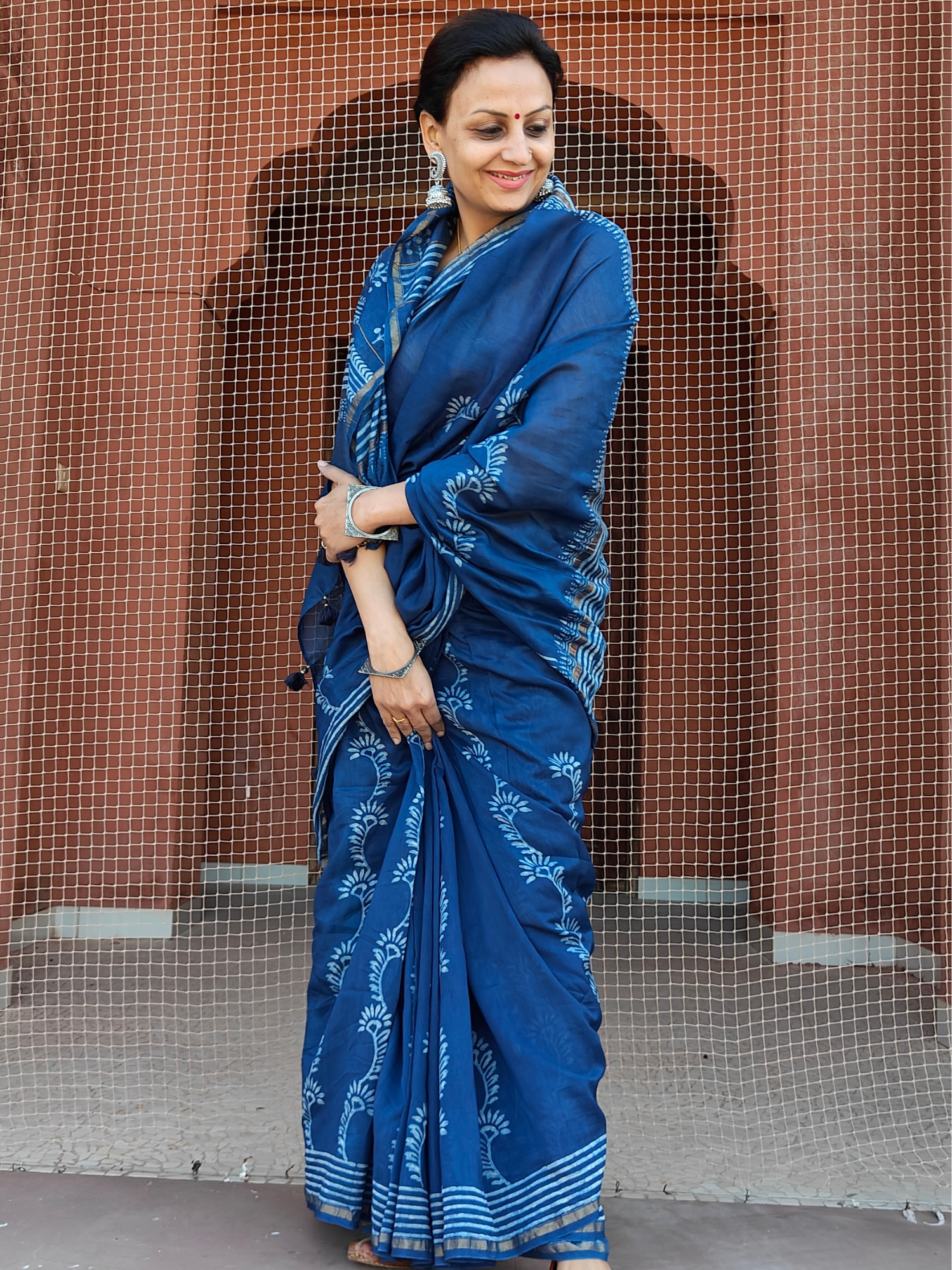 Indigo with White Buta Cotton Handblock Curtain (Pair of 2 Curtains)