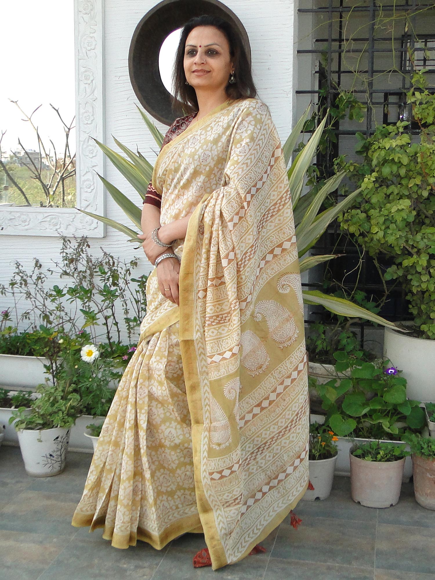 Yellow and Brown Gulbahar Cotton Handblock Curtain (Pair of 2 Curtains)