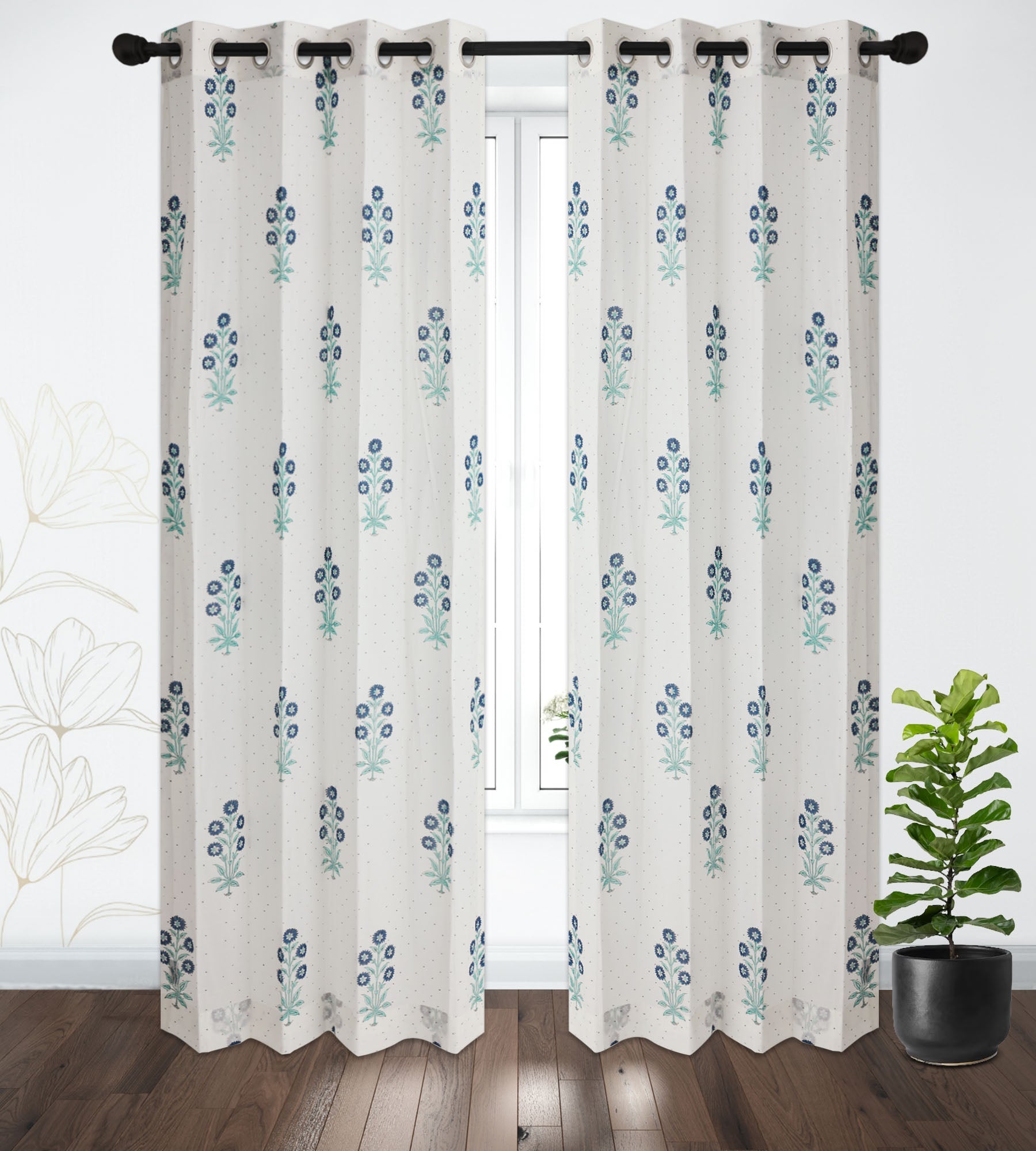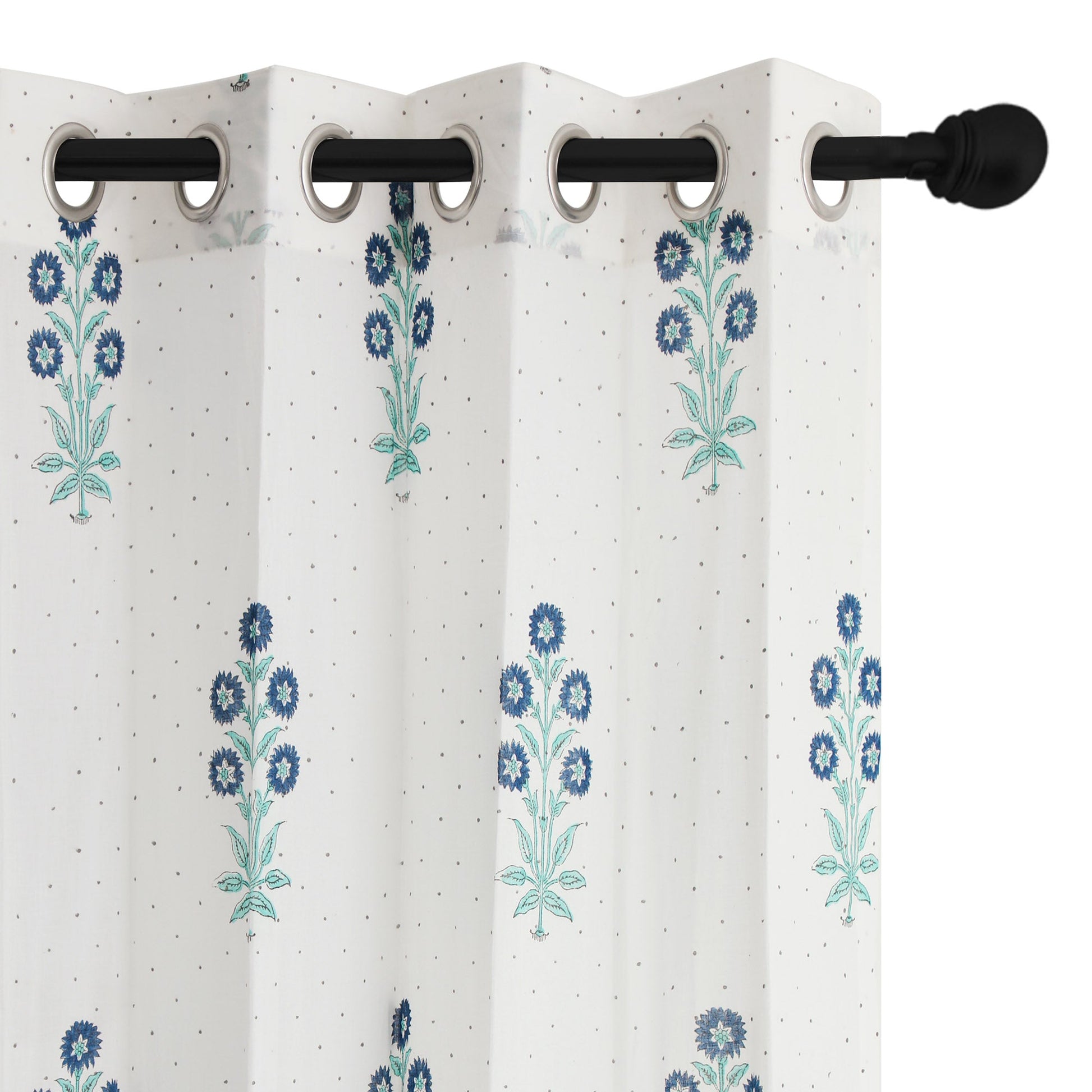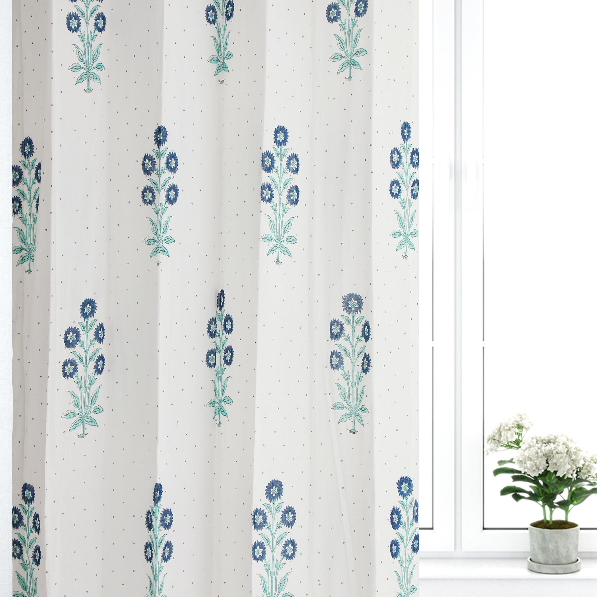 Blue and Seagreen Gulbahar Dotted Cotton Handblock Curtain (Pair of 2 Curtains)