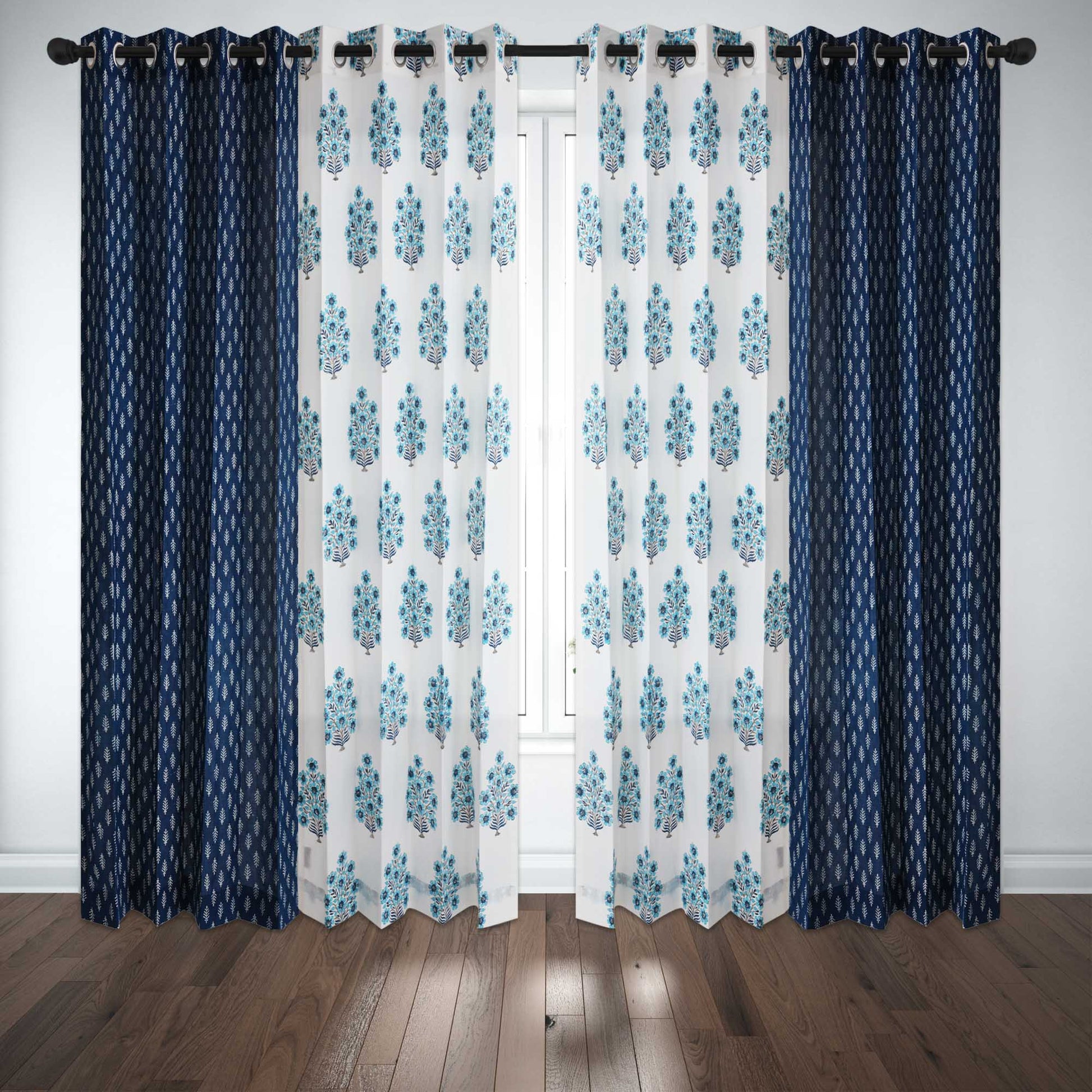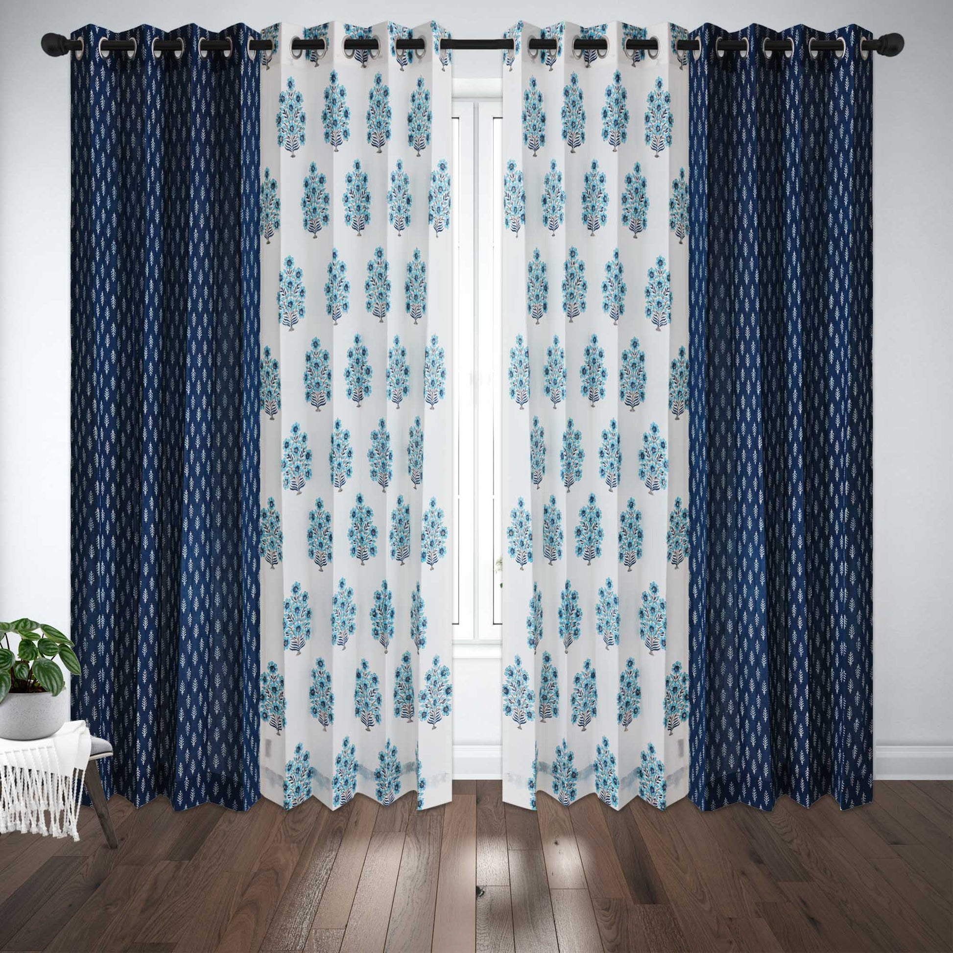 Blue Gulbahar with Indigo White Buta Cotton Handblock Curtain Combo (Set of 4 Curtains