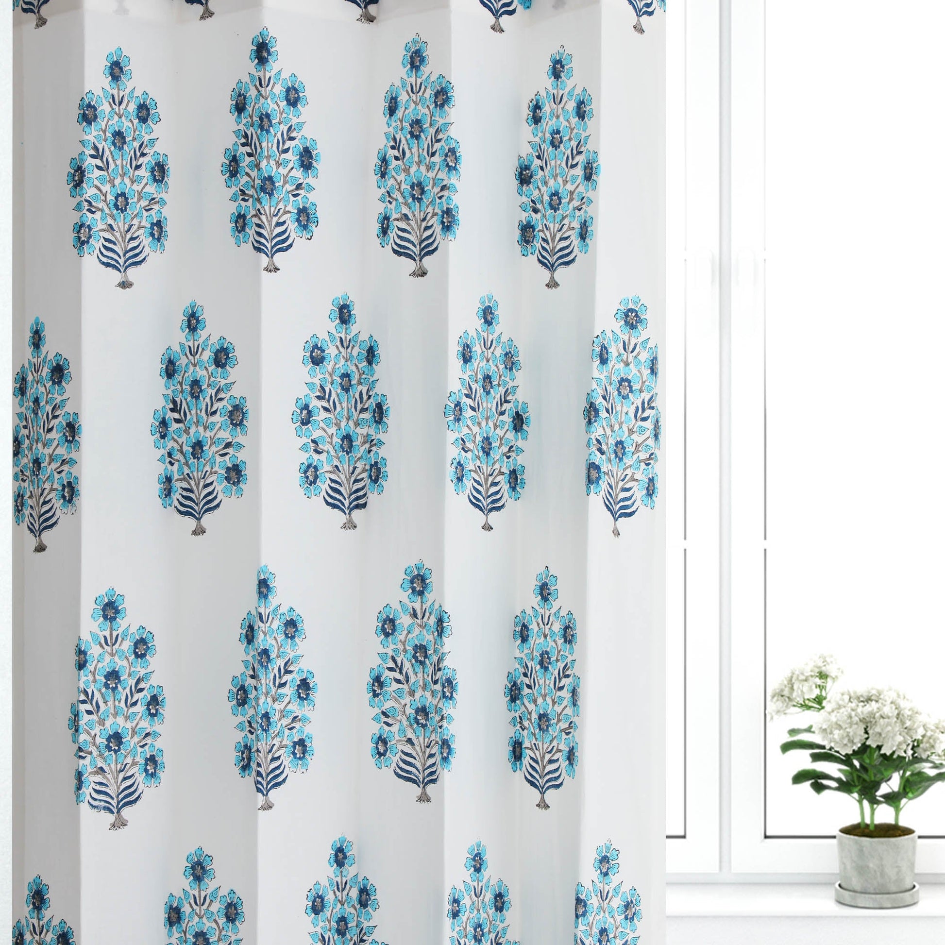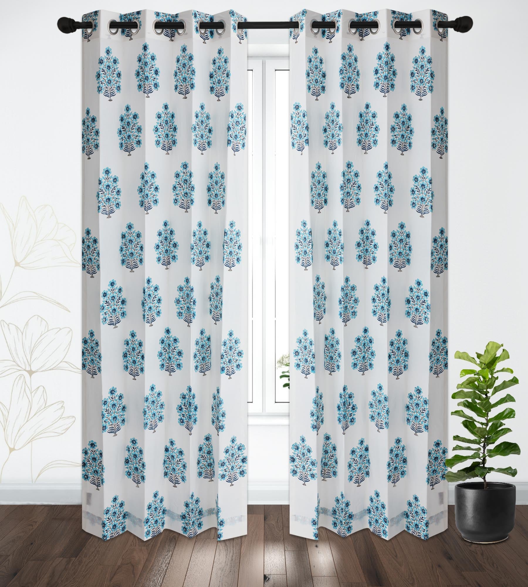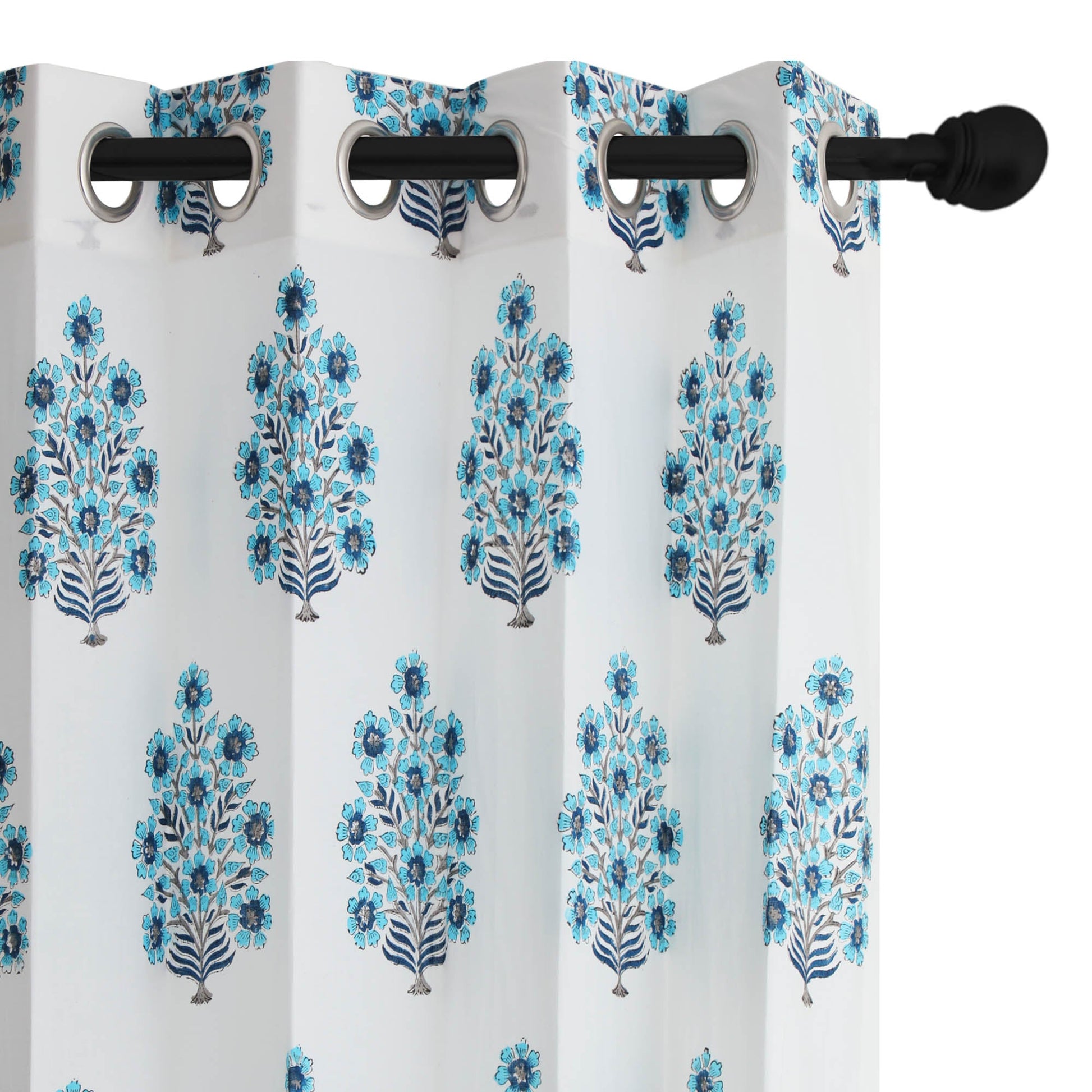 Blue Gulbahar Cotton Handblock Curtain (Pair of 2 Curtains)