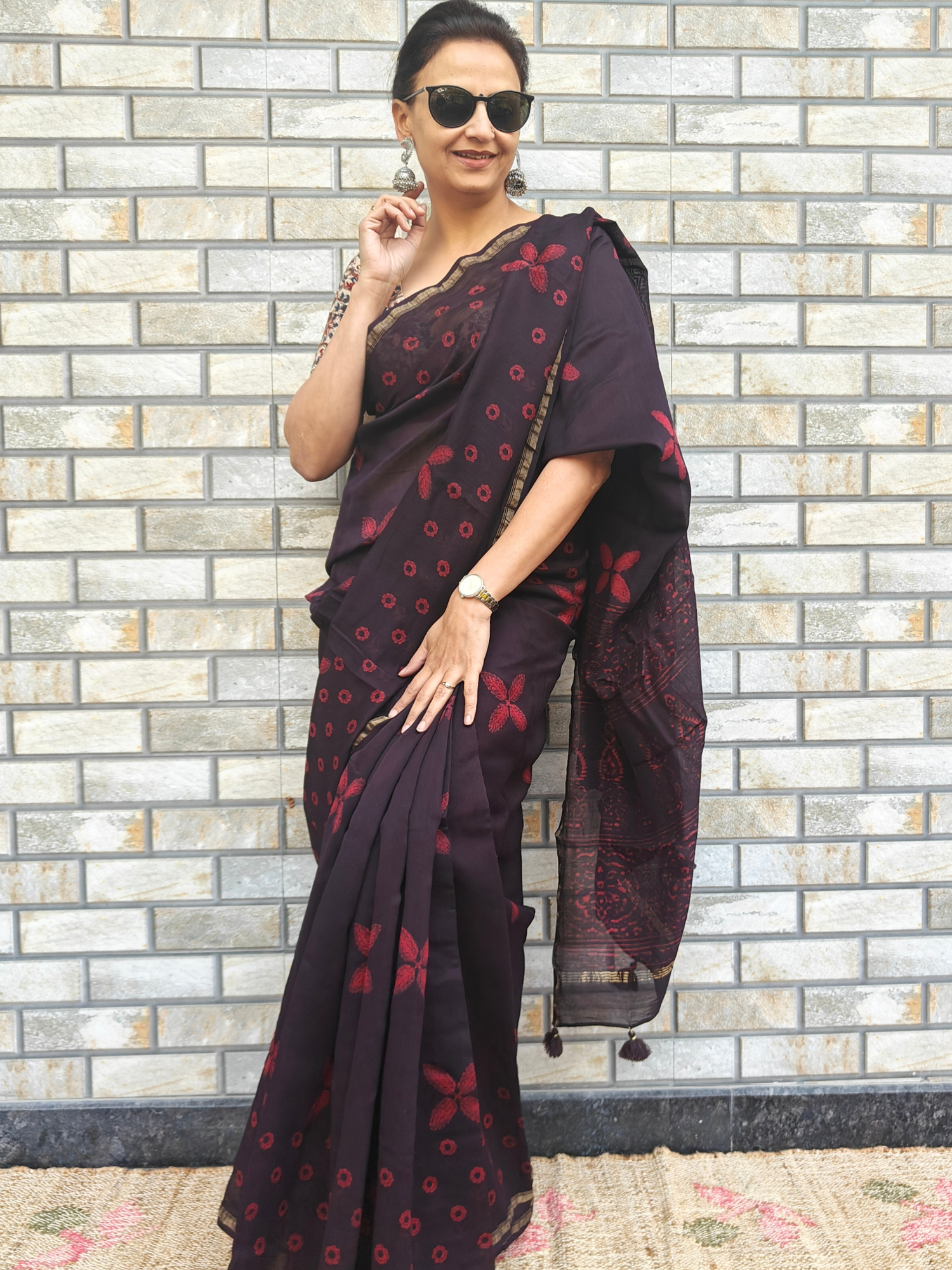 Coffee-Maroon Dabu Handblock Print Chanderi Saree