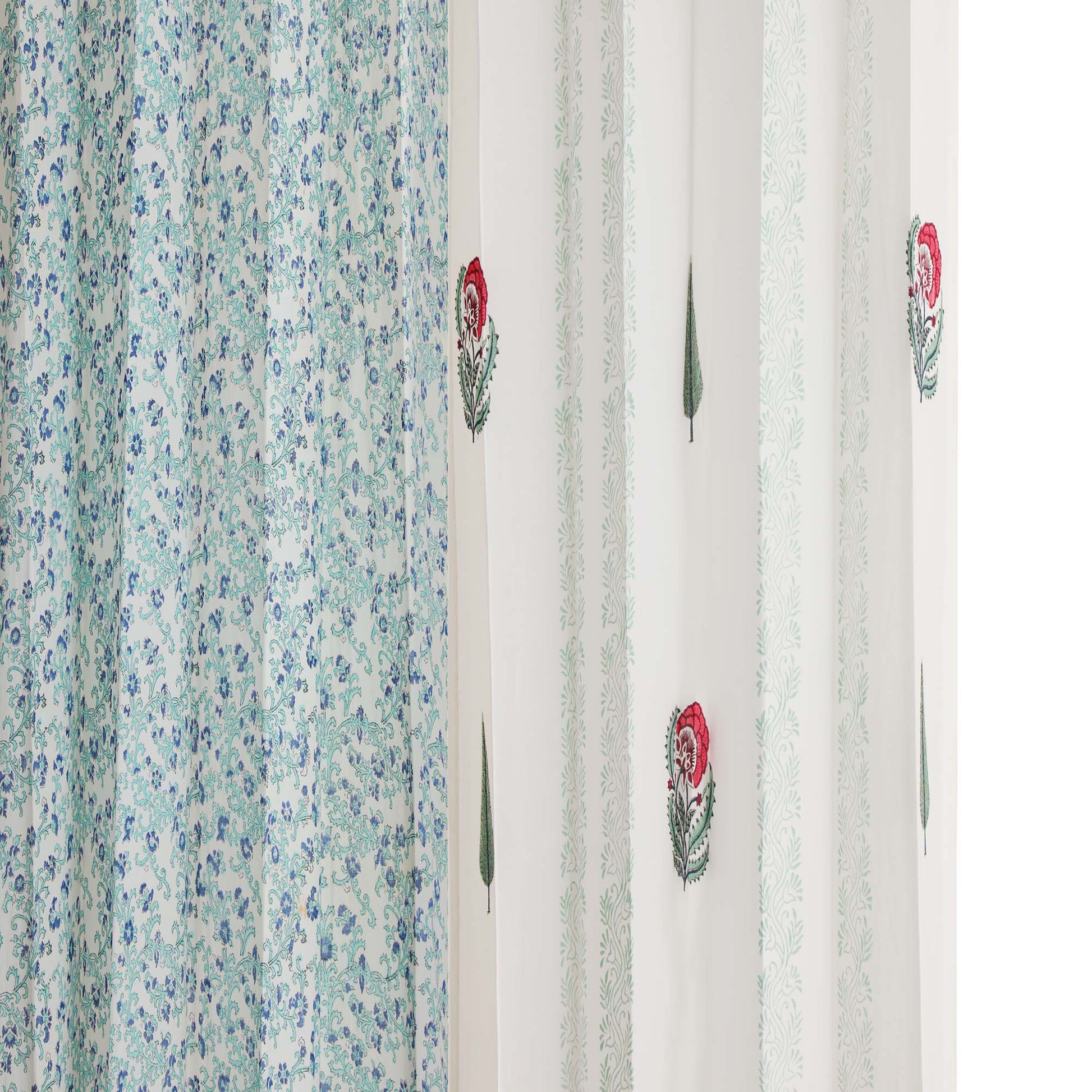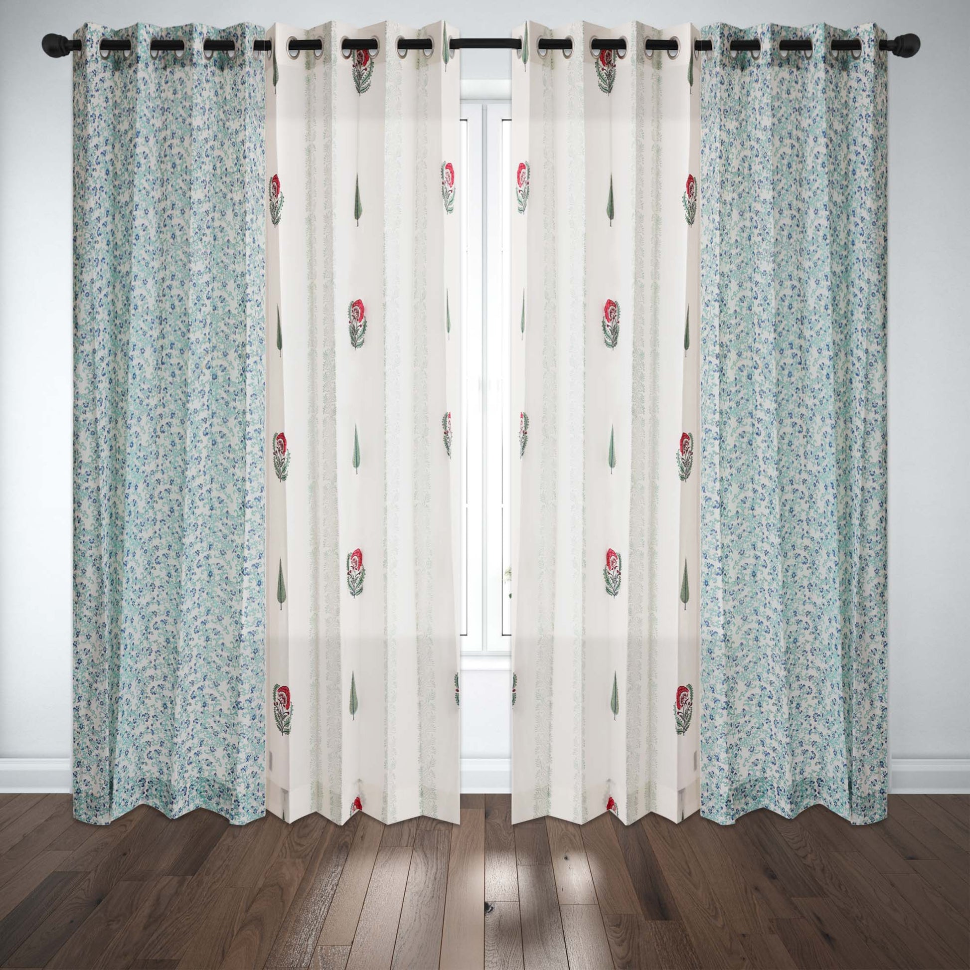 Gulmohar Buta and Cyprus with Blue SeaGreen Jaal Cotton Handblock Combo (Set of 4 Curtains)