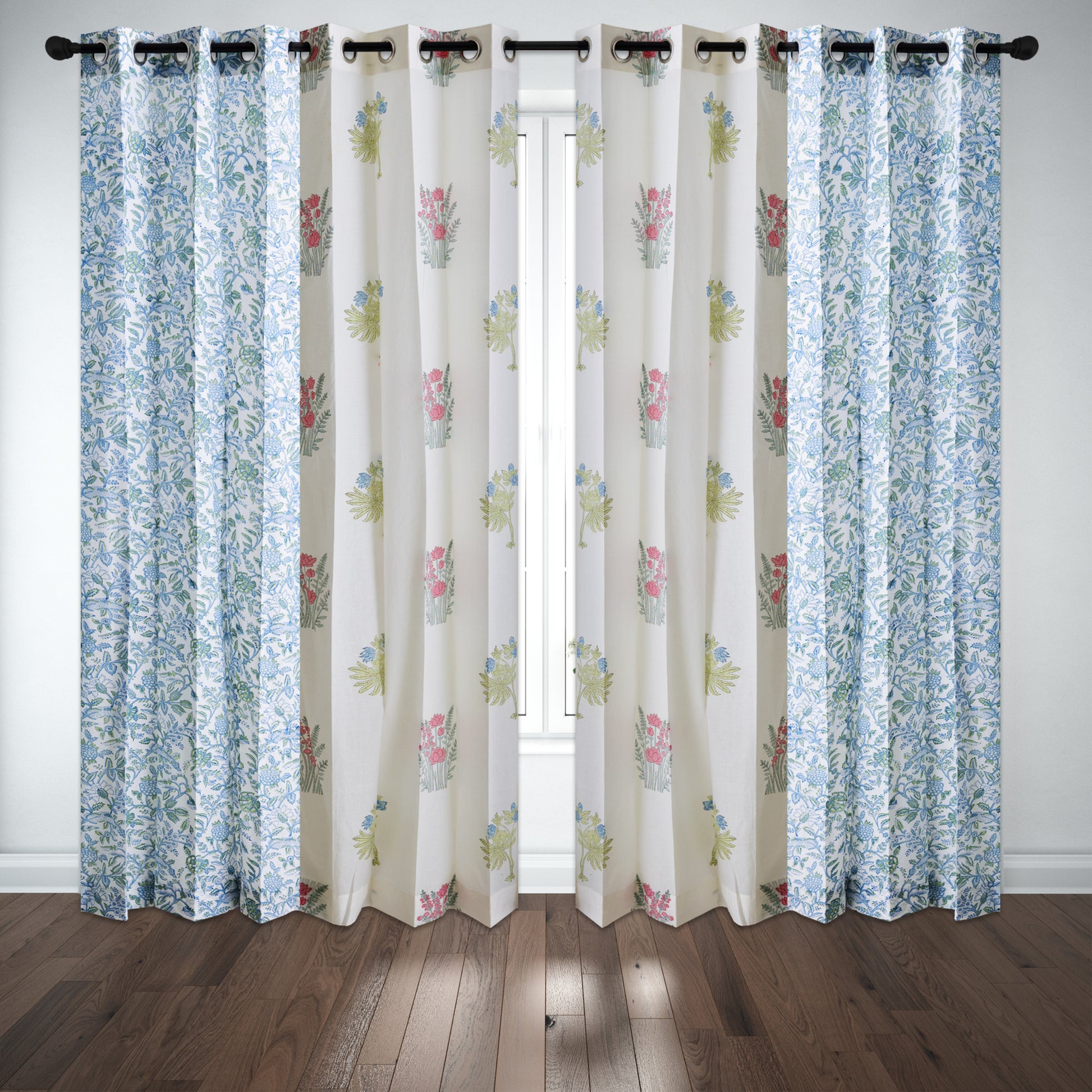 Skyblue and Seagreen Jaal with Morning Meadow Boota Cotton Handblock Combo (Set of 4 Curtains)
