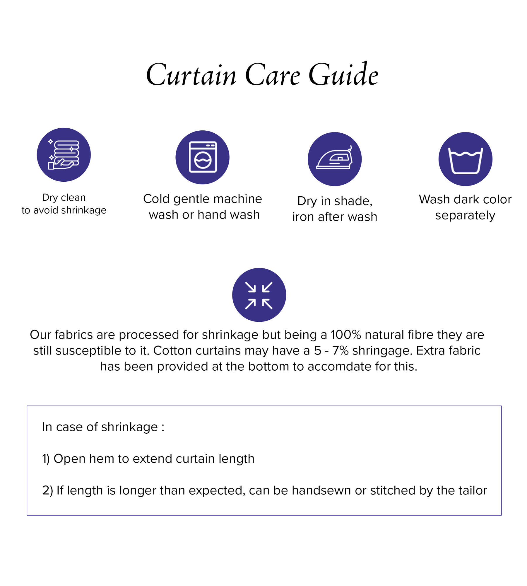 Gentle hand or machine wash in cold water using a mild detergent. Dry in shade. Use a warm iron. Our cotton fabrics are processed for shrinkage but being a natural fiber, they are still susceptible to shrinkage.