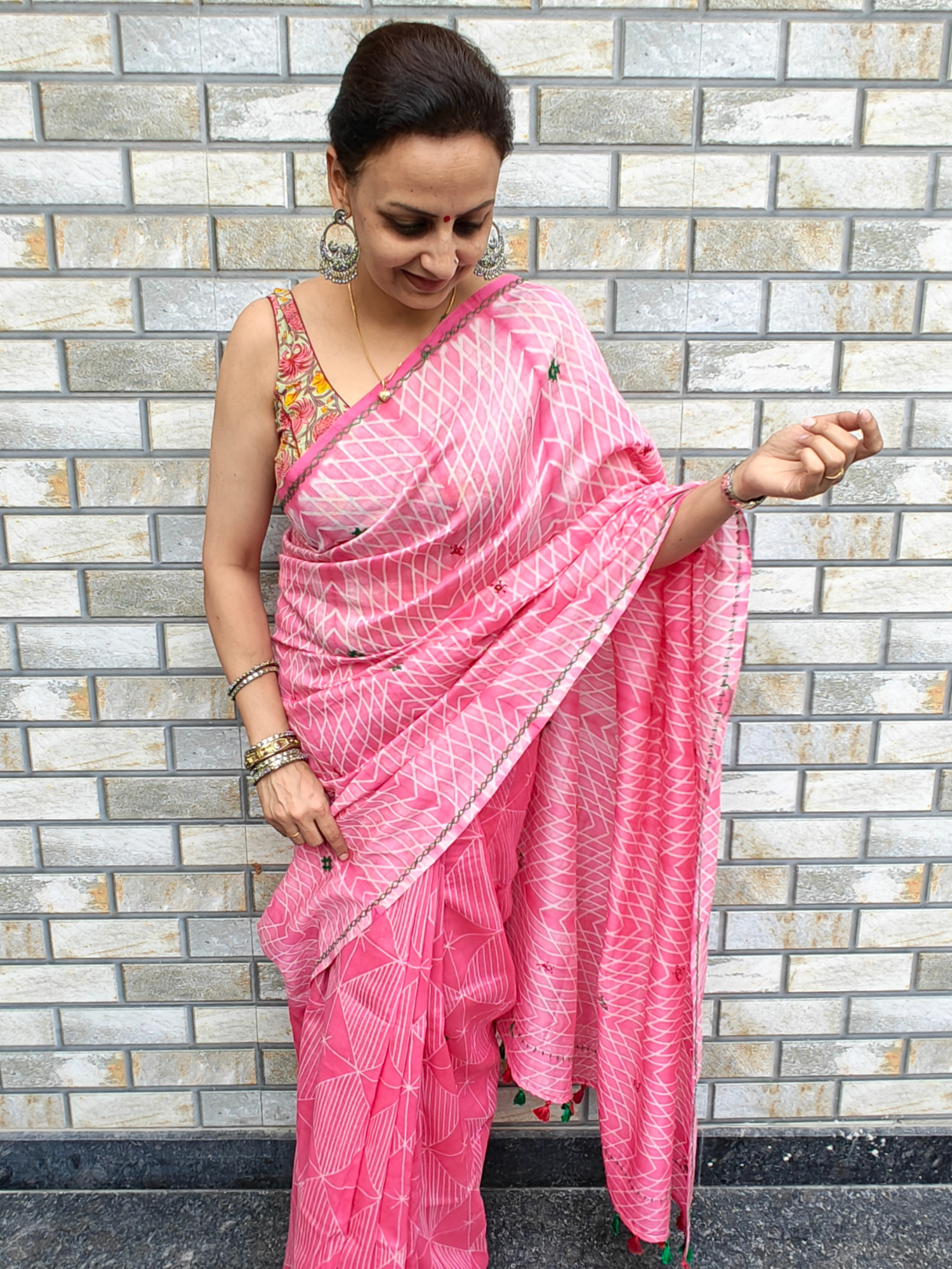 Description : SILK-COTTON CHANDERI WITH SHIBORI PRINT, HAND EMBRIODERED BODY AND PALLA, ACCESSORIED WITH TASSELS. THE SAREE COMES WITH PLAIN BASE COLOUR HAND EMBRIODERED BLOUSE PIECE.
