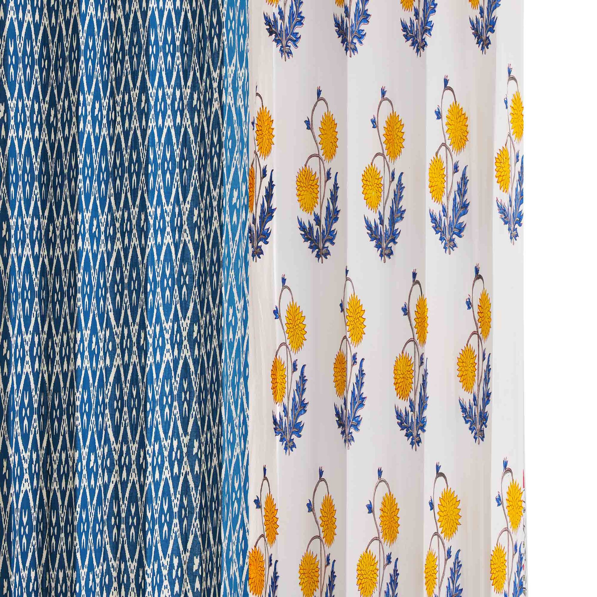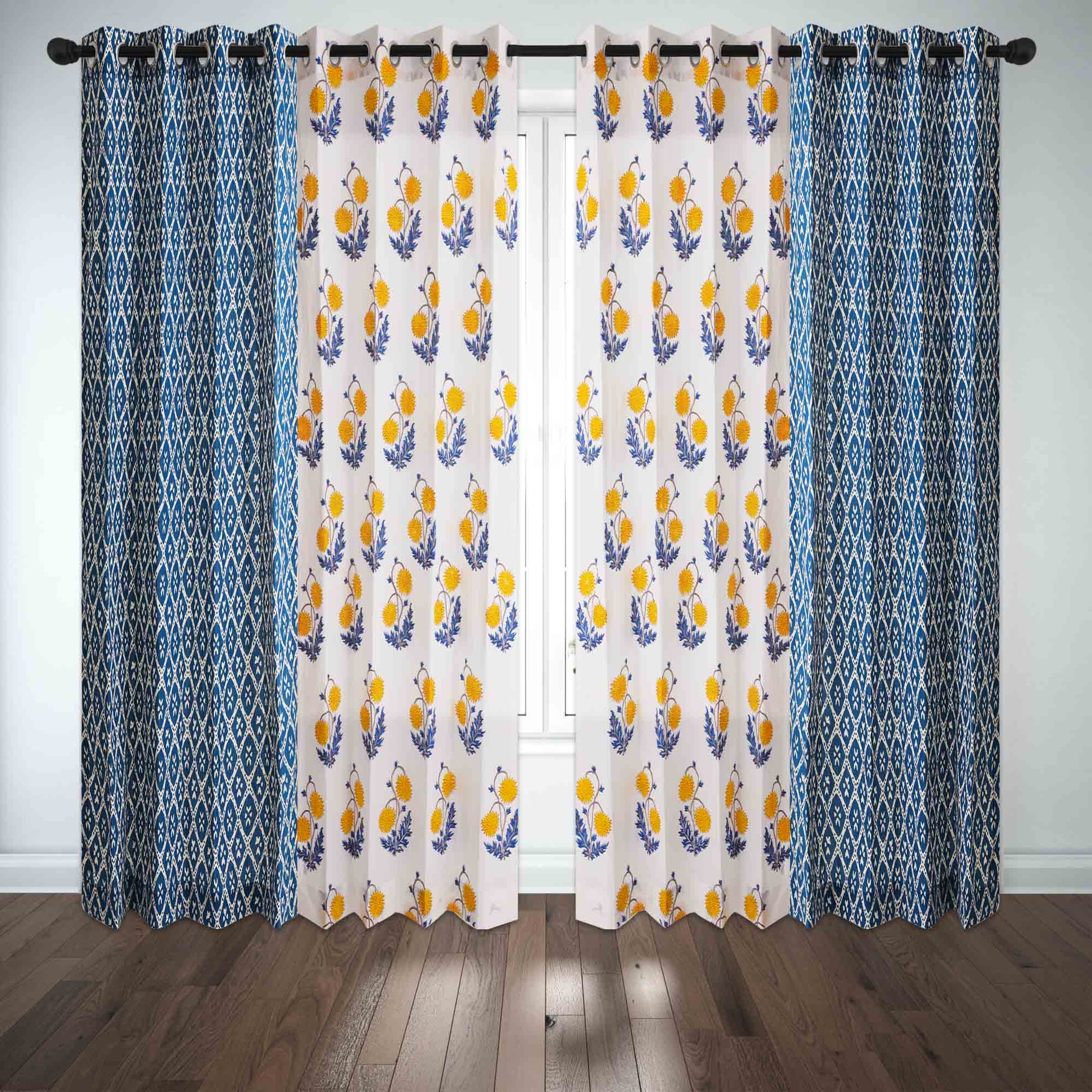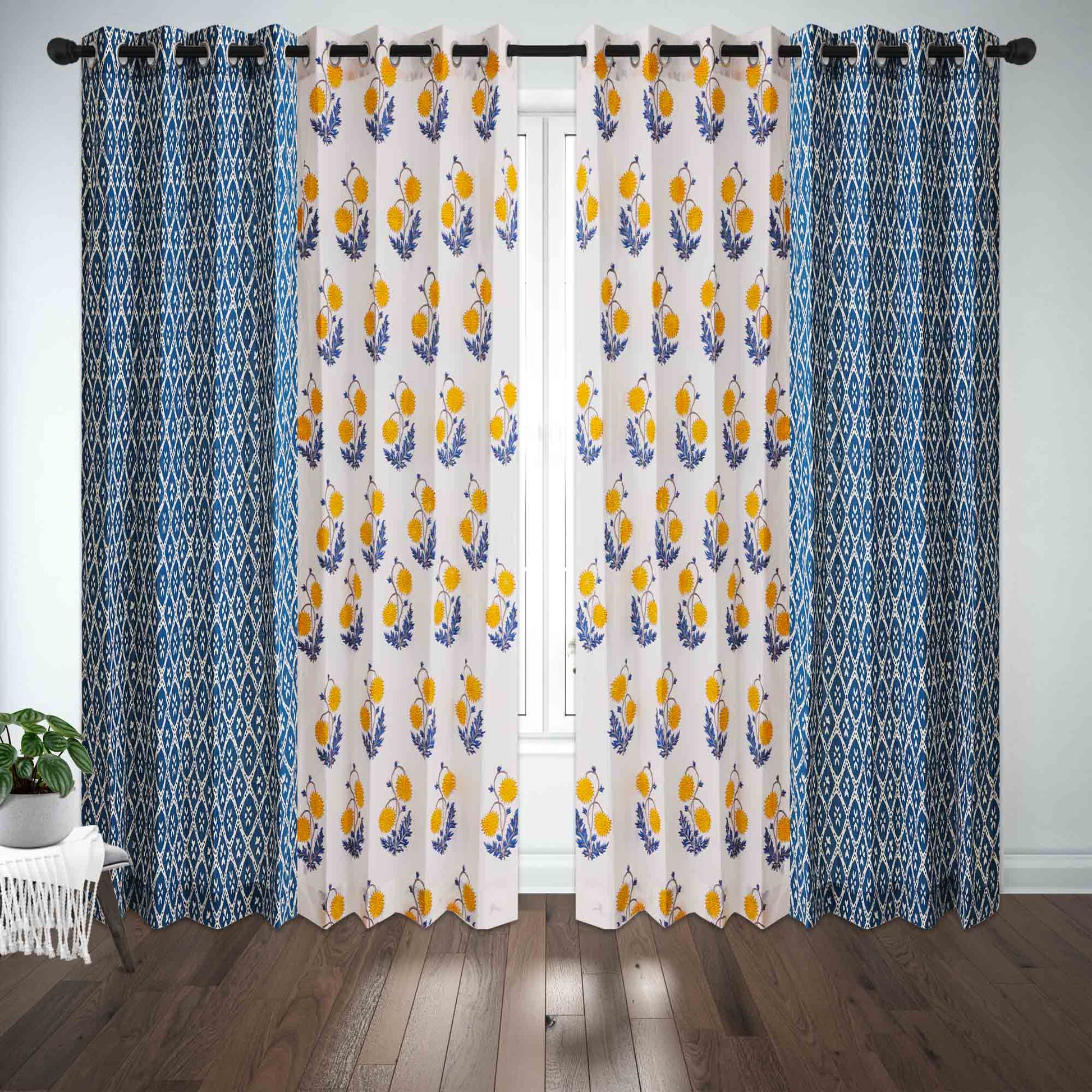 Yellow Blue Sunflower with Geometric Indigo Cotton Handblock Combo (Set of 4 Curtains)